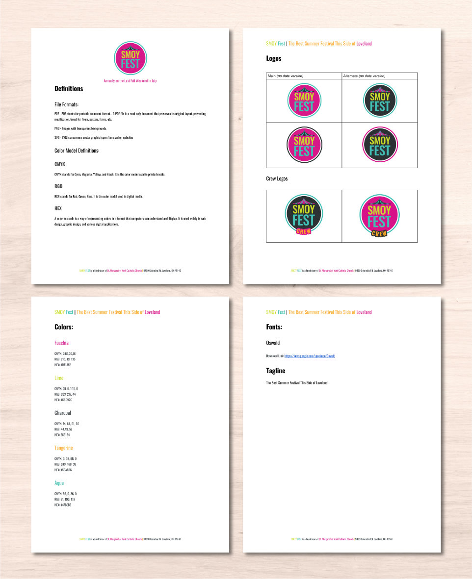 SMOY Fest is the largest fundraiser for St. Margaret of York held annually each Summer during the last weekend of July. The old branding had been in use for sometime and was feeling a bit stale. As part of the parish’s 40th Anniversary I was asked to give the brand a refresh with its own unique stand alone branding from the parish’s main brand that could be used for the next decade.