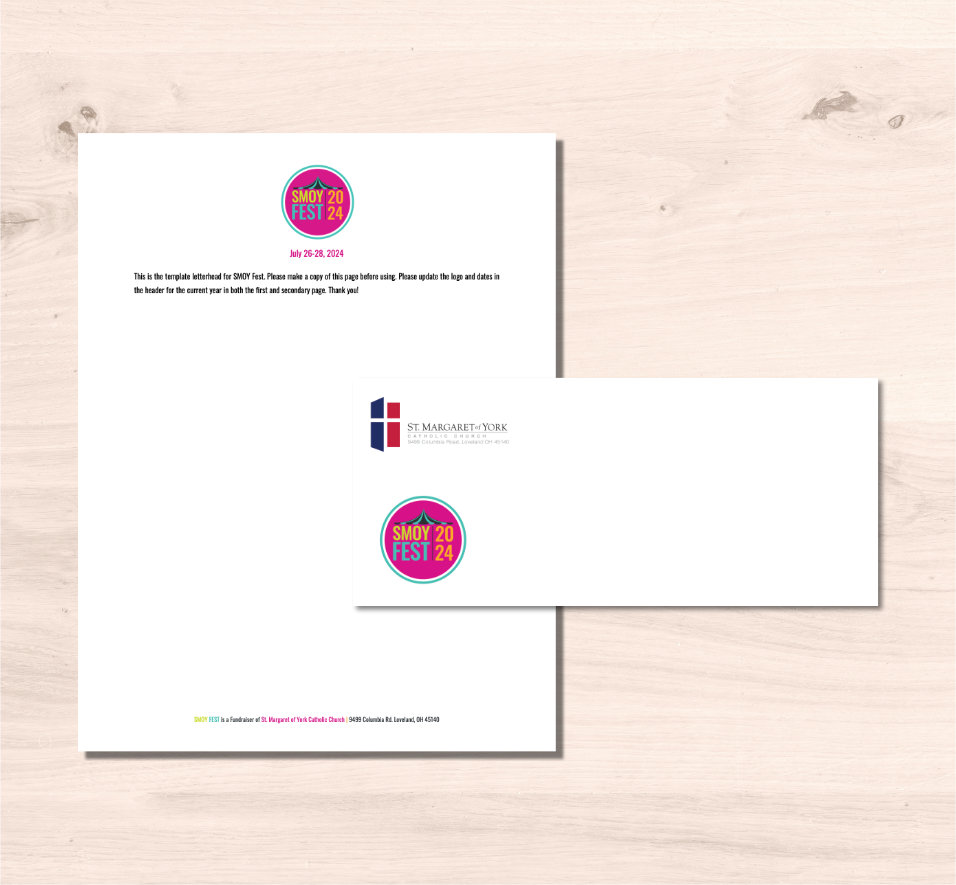 The stationary a letterhead and an envelope are primarily used for soliciting donations and to send to past donars as well as thank yous after the event. A custom letterhead was made for the event and the envelope used the parish's main stationary with the addtion of the festival logo.