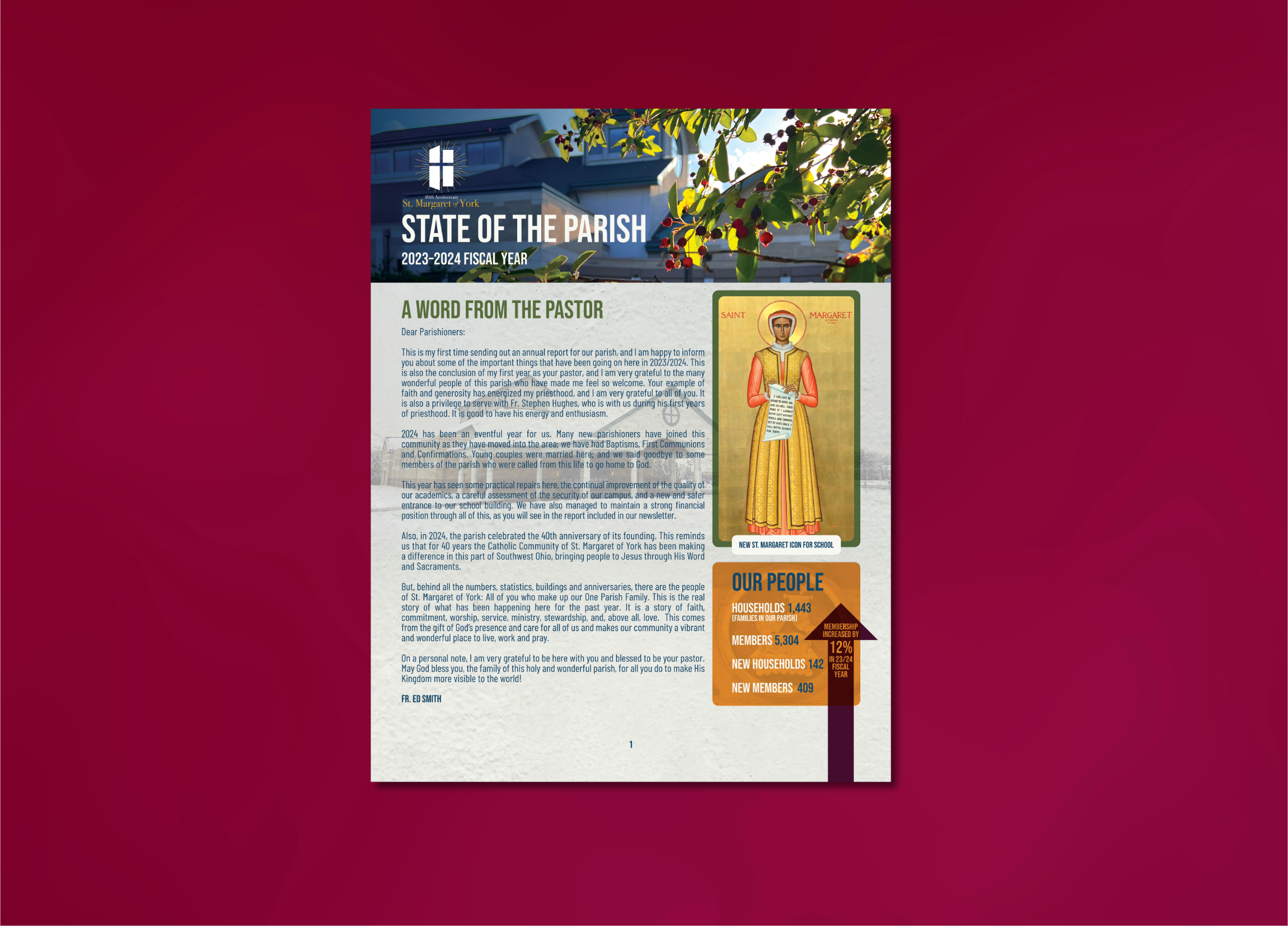 The project needed to be completed within a two-week turnaround, and was limited to four pages. A key challenge was incorporating a high volume of images, including the newly commissioned St. Margaret icon, while incorporating paragraphs of information and making data more visual and engaging. The design aimed to be brand-adjacent—resembling the parish’s identity but distinct from the standard visual identity. My role was to lead the layout and visual design, ensuring the report was informative, visually appealing, and easy to navigate.