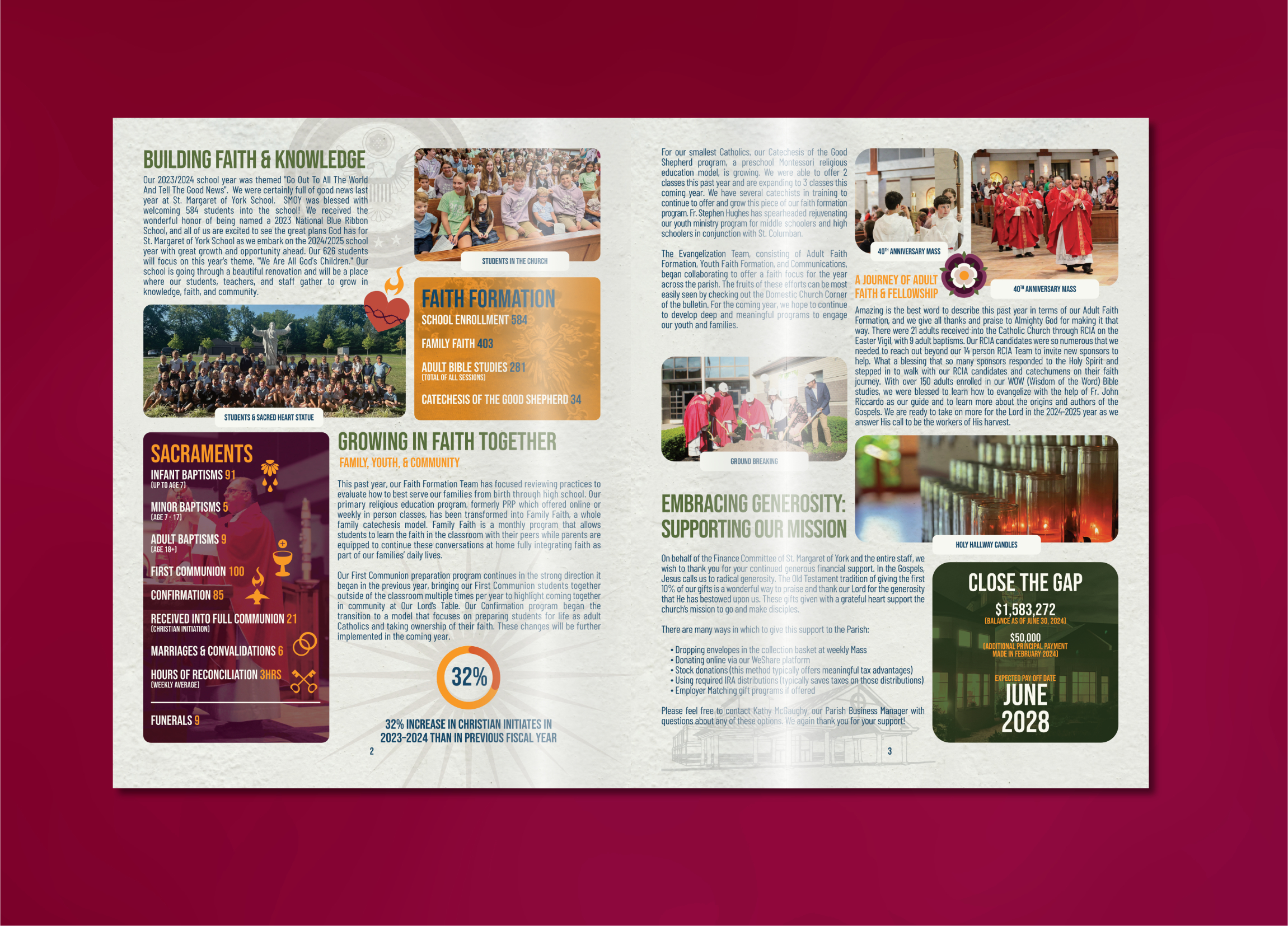Imagery was selected based on key moments the organization wanted to highlight such as the 40th Anniversary Mass and Ground Breaking Ceremony as well as updated pictures from around our campus, highlighting the beauty of the campus facilities.